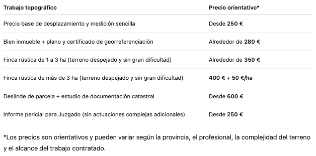 A continuación se muestra una tabla orientativa con precios habituales de algunos trabajos de topografía. No son tarifas cerradas, sino referencias medias para tener una idea de cuánto puede costar el servicio: