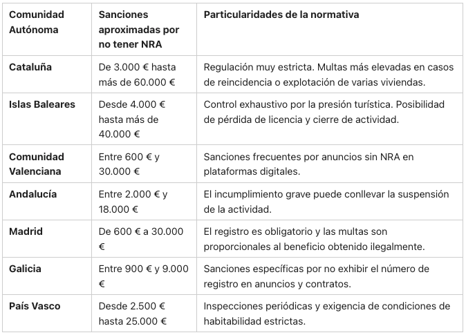 Las sanciones económicas por no inscribir una vivienda turística en el registro y no disponer del Número de Registro de Alquiler (NRA) cambian en función de cada comunidad autónoma. A continuación se muestran algunos de los rangos más habituales y las normativas más estrictas: