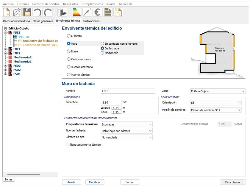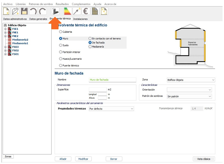 Una vez definido el Patrón Sombras Sureste 1, lo asociamos a la fachada correspondiente. Para ello, cerramos el panel Patrón de sombras y desde el panel Envolvente térmica seleccionamos la fachada y le asignamos el patrón.