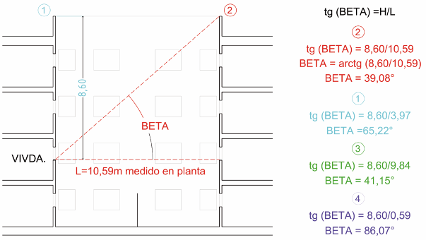 El cálculo de ß se puede realizar de manera analítica. Para ello calculamos la tangente del cociente entre la longitud L de cada línea y su elevación H. De ahí despejamos el ángulo calculando el arco-tangente de dicho cociente. Ya tenemos el valor de la elevación solar para cada vértice tal y como se muestra en la imagen inferior.