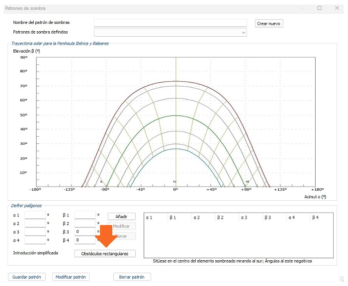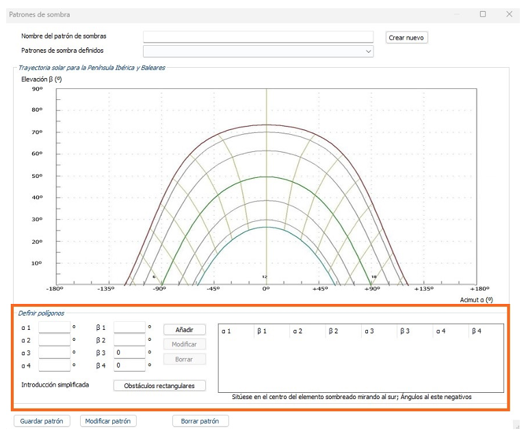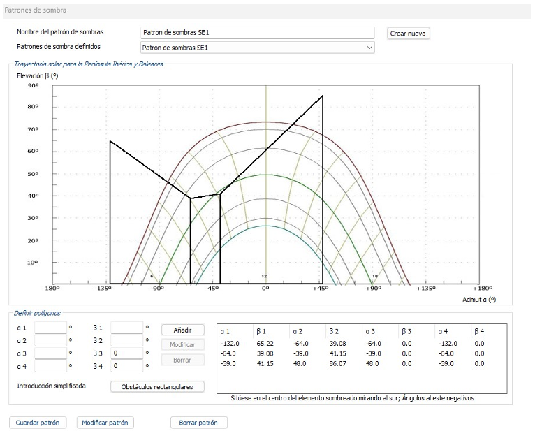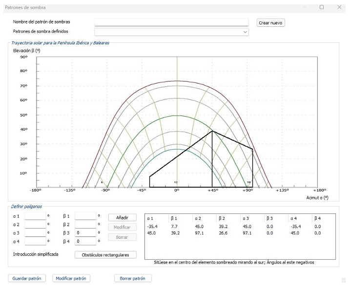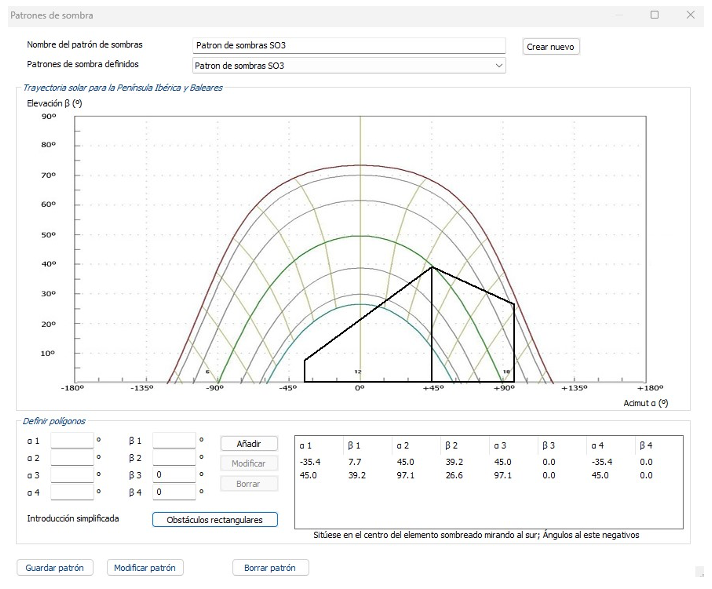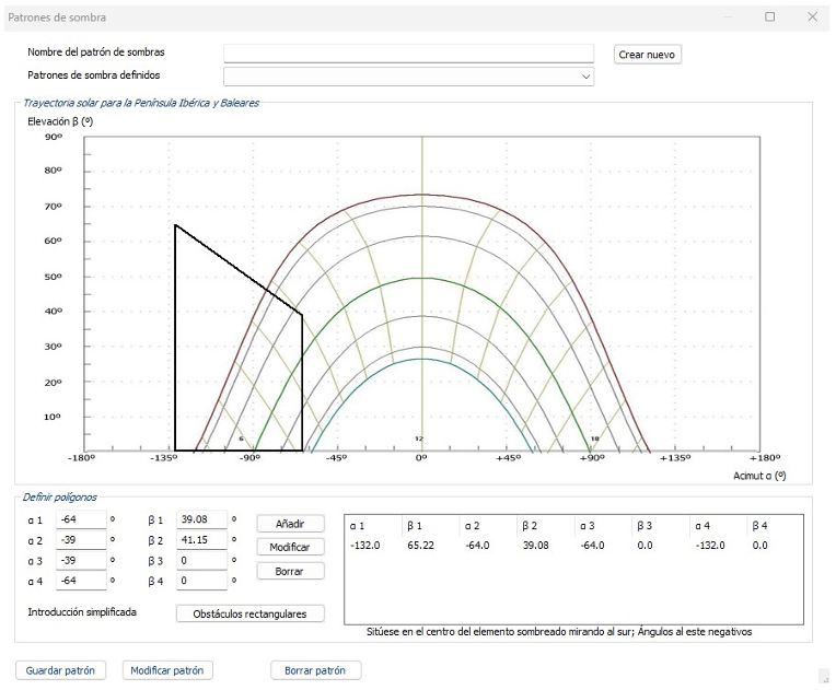 Desde el panel Patrones de sombras introducimos los valores de acimut α y elevación solar ß de los vértices superiores de cada plano y que hemos calculado previamente.