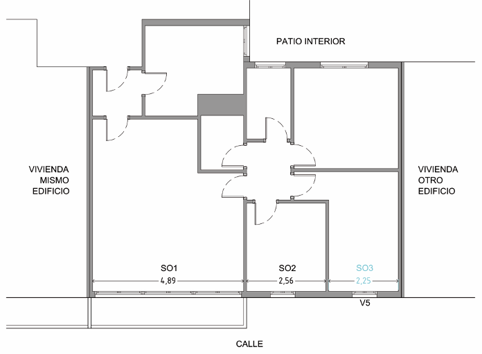 En este ejemplo vamos a calcular el patrón de sombras de una fachada exterior sobre la que el edificio de enfrente le proyecta sombra con la introducción simplificada. Este es el caso de la fachada Suroeste 3 de la vivienda que estamos utilizando como ejemplo y que aparece acotada en el plano en la imagen.