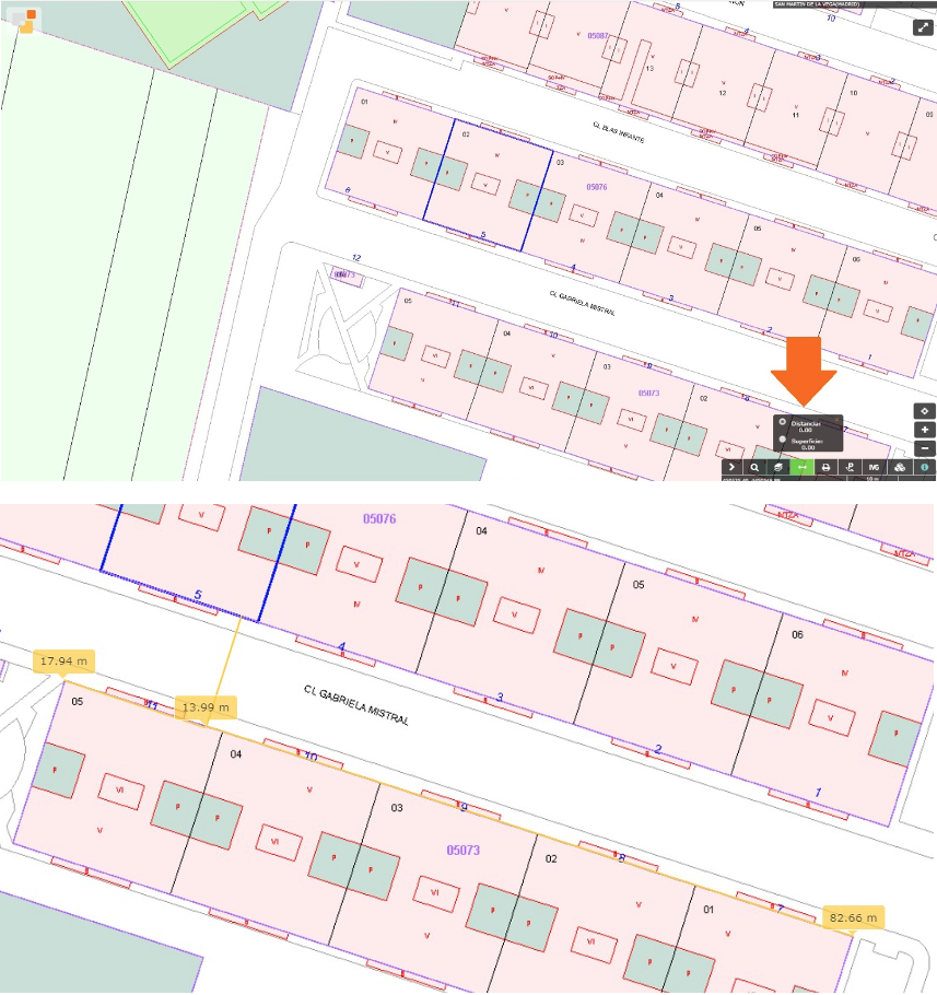Para medir las distancias d, d1 y d2 para la introducción simplificada, acudimos a la sede electrónica del catastro, y con la herramienta distancia medimos las longitudes correspondientes.
