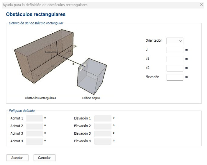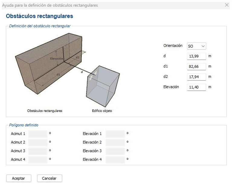 La opción simplificada para la definición de patrones de sombra es válida para la introducción de obstáculos remotos rectangulares paralelos al elemento sobre el que proyecta sombra. Esta circunstancia se da habitualmente en fachadas exteriores a la vía pública que tiene edificios enfrente que proyectan sombra.
