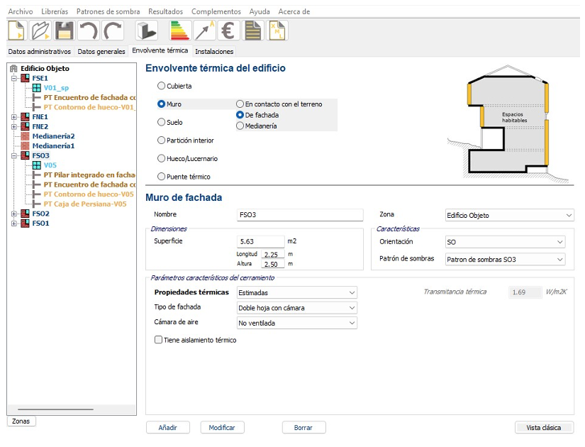 Por último volvemos al panel Envolvente térmica y asignamos el patrón a la fachada Suroeste 3.