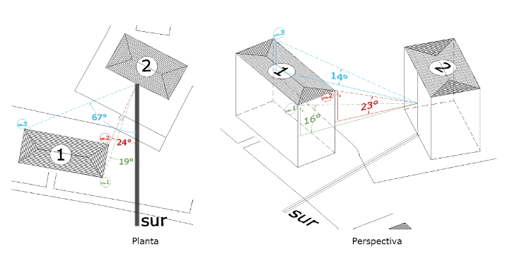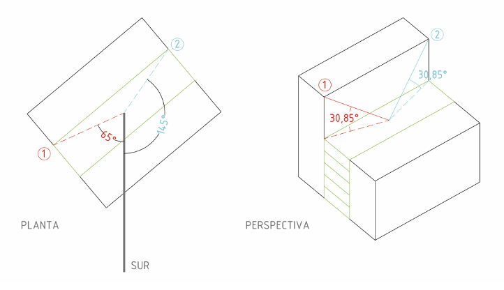 A continuación se mide el acimut α de cada vértice y seguidamente se calcula la elevación solar ß.