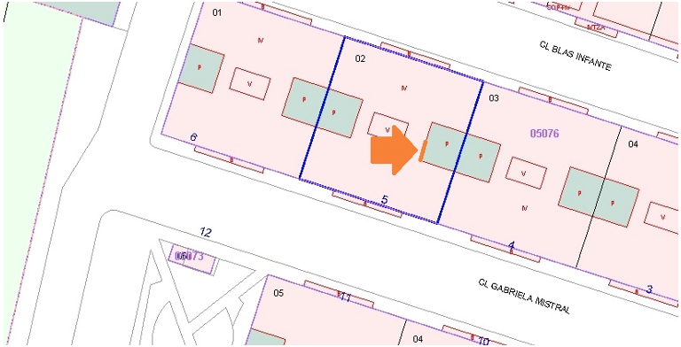 En la imagen inferior se ha identificado la fachada de la vivienda individual de la cual vamos a calcular el patrón de sombra con el procedimiento general. Una fachada sobre la que proyecta sombra el resto de fachadas que definen el patio interior perteneciente al propio edificio y al edificio adyacente.