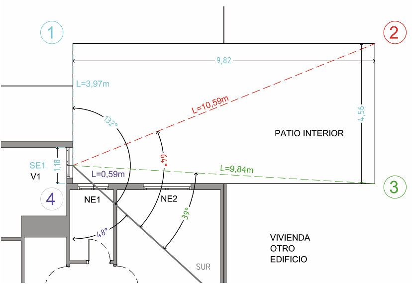 En primer lugar, se identifica la fachada en el plano de la vivienda. A continuación hacemos un zoom en el entorno del patio (imagen inferior). Se observa que sobre la fachada SE1 proyectan sombra los planos 1-2, 2-3 y 3-4. Trazamos líneas desde el punto medio de la fachada SE1 hasta cada vértice y medimos su longitud.