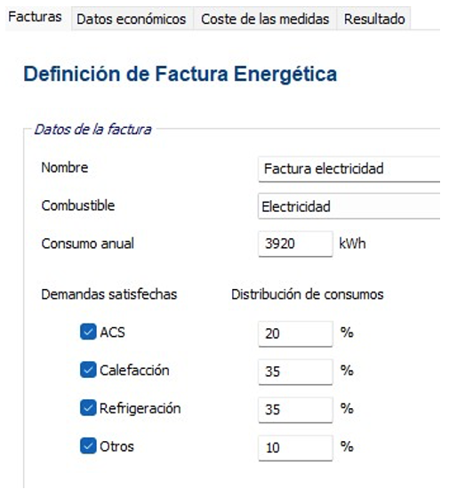 - Panel Facturas: si el cliente facilita las facturas de consumo asociado a cada combustible en la vivienda, se introducen una a una. No obstante no es imprescindible completar este panel para realizar el análisis económico. El proceso consiste en: