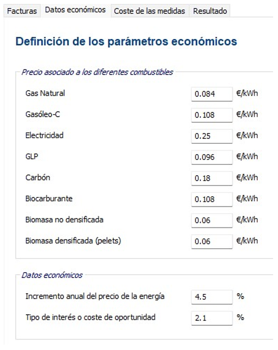 Panel Datos económicos: si las medidas se han definido con el complemento, éste descarga los precios de cada combustible así como los Datos económicos para el cálculo en los campos asociados. Estos valores se pueden editar.