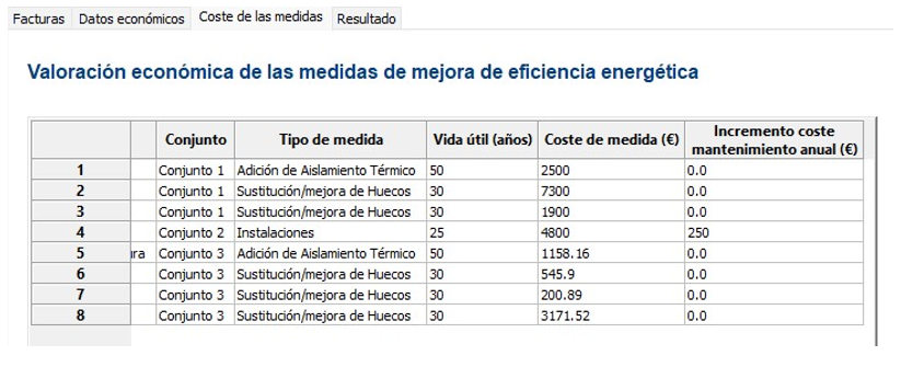 - Coste de las medidas: si las medidas se han definido con el complemento, éste calcula internamente el coste económico y lo vuelca en la celda correspondiente en la tabla. En caso contrario el técnico debe completar las celdas de vida útil (50 años para elementos arquitectónicos y 15/25 para instalaciones térmicas), coste de medida e incremento del coste por mantenimiento anual, ambos en euros.